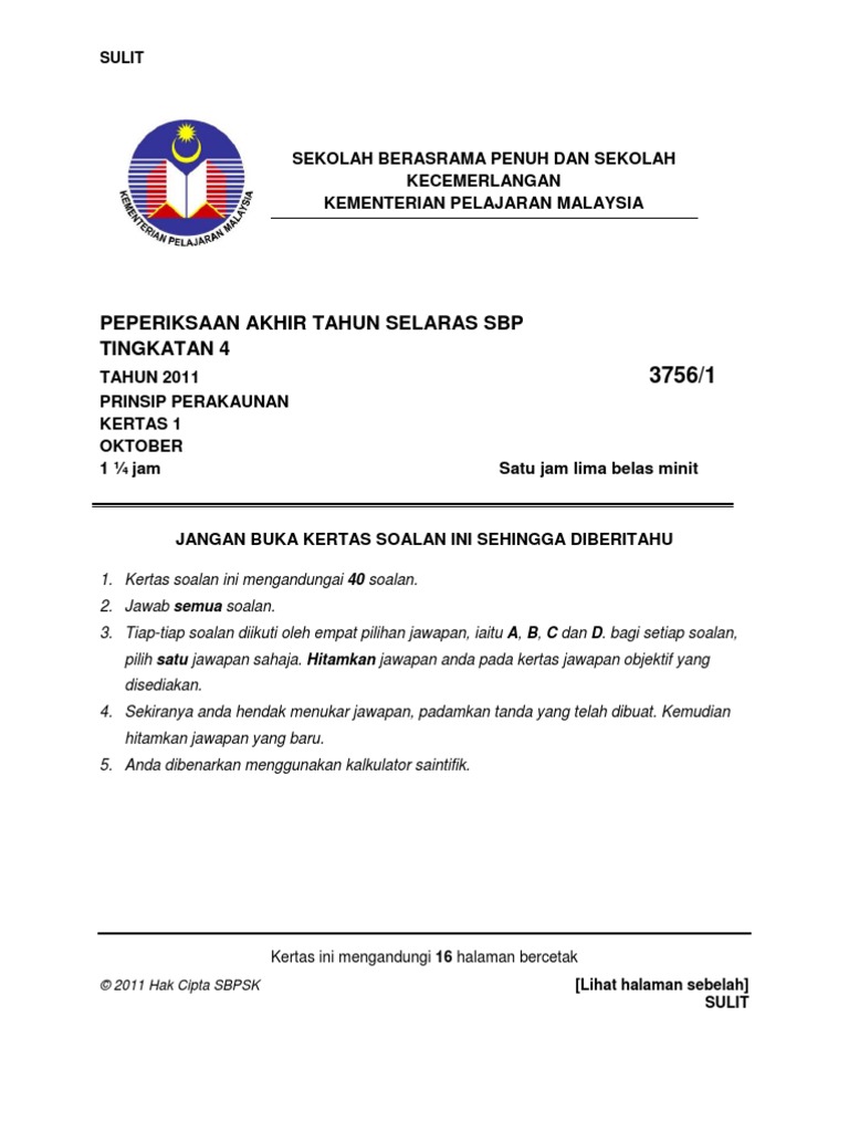 Peperiksaan Akhir Tahun Sbp 2011 Ting 4 Prinsip Perakaunan Kertas 1 Pdf